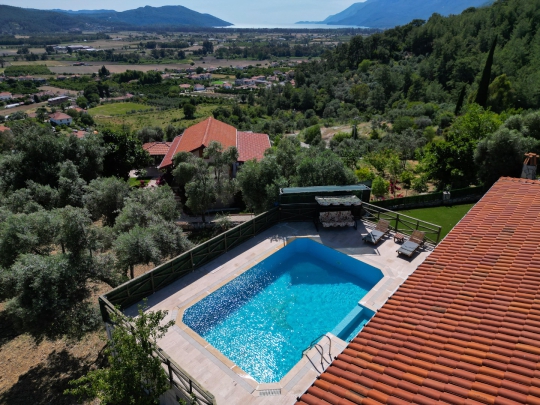 banyo bulunmaktadır. Villanın, şemsiye ve şezlonglarla donatılmış havuzun yanında ayrıca
