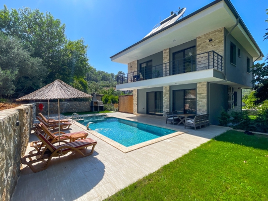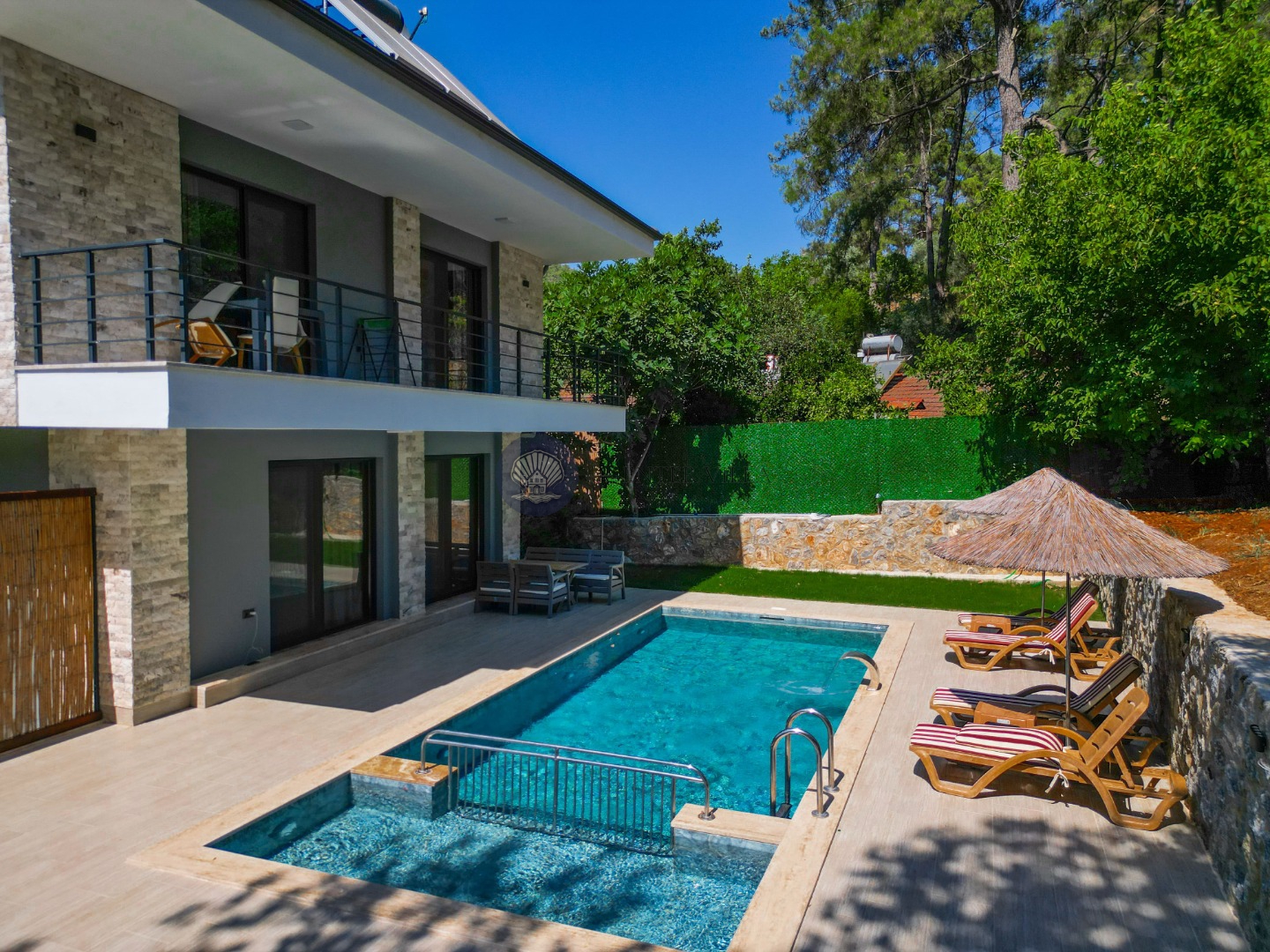 dizaynı oldukça keyifli olan villamızda havuz başında muhafazakar ve huzurlu bir tatil